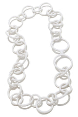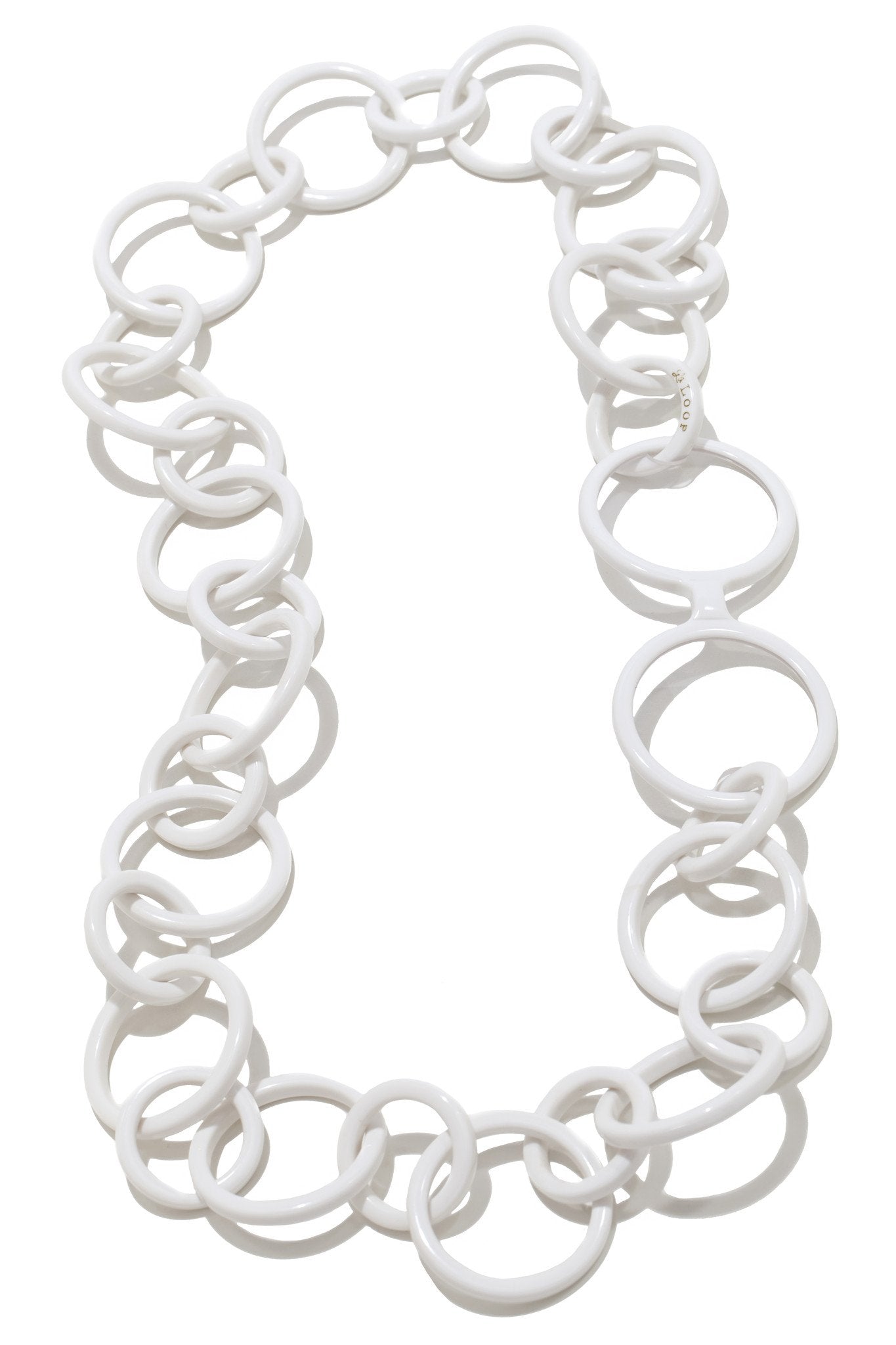 The Le Collier reader necklace was created when La LOOP founder Elizabeth Faraut watched as a woman repeatedly put on and took off her readers to examine a menu. With the Le Collier, readers are built into a beautiful acetate necklace, easily disguised, but always at your fingertips. In white Italian acetate.