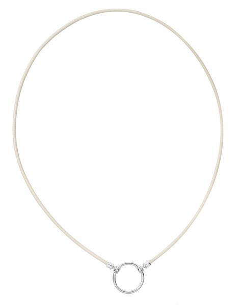 The white Italian smooth leather in this piece is handmade in a 5th generation mill outside of Venice, Italy. Material: Italian Smooth Leather in White Loop: 23mm in diameter; Silver Plated Necklace length: 25 inches