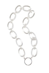 The crystal, clear oval links (28x42mm) in this piece are made from hand-finished acetate resin. This style is great for casual weekend wear, yet also translates to a professional setting. Material: Hand-finished Italian Acetate in Crystal Clear Loop: 30mm in diameter; Silver Plated Necklace length: 25 inches