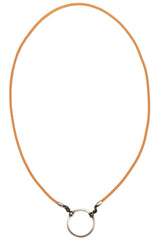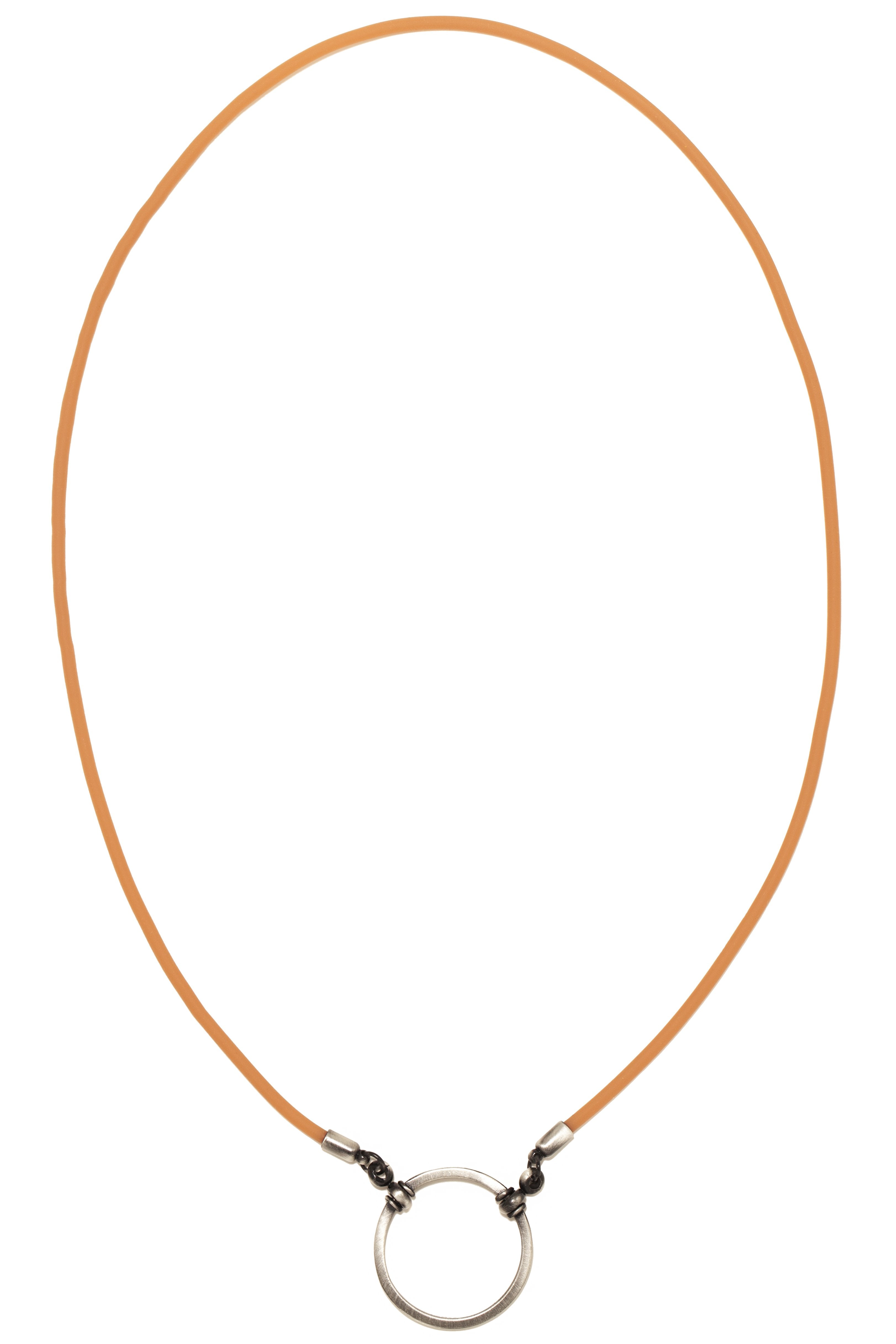 From our bridge line LOOOP, this piece is simple yet sleek. The rust rubber makes this functional style a casual favorite for everyone. Material: Rubber Cord in Rust (3mm) Loop: 30mm in diameter; Antique Silver Finish (made from lead free zinc alloy, normal zinc alloy, and brass) Necklace length: 25 inches