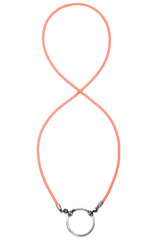 From our bridge line, LOOOP, our silk stretch styles add just the right chic and sporty touch. These stretch over the head and are popular styles for both men and women. The fun tangerine color in this piece makes any outfit pop. Material: Silk Stretch in Tangerine (3mm)  Loop: 30mm in diameter; Antique Silver Finish (made from lead free zinc alloy, normal zinc alloy, and brass) Necklace length: 25 inches