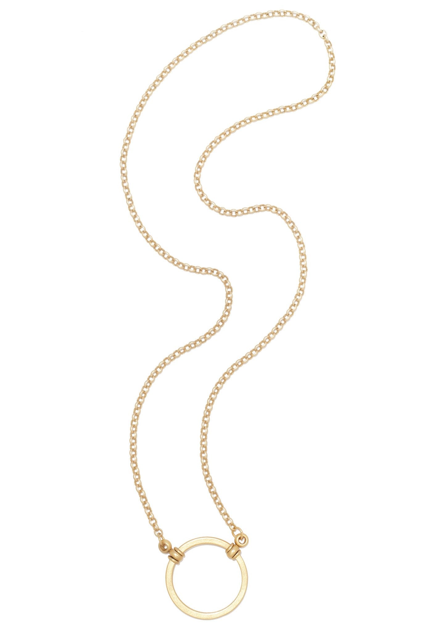 From our bridge line, LOOOP, this piece has an air of sophistication and elegance.  The satin gold-dipped chain and loop make this a style that's both subtle and versatile.   Material: Copper Mini Round-link Chain with 14K Satin Gold Plating Loop: 30mm in diameter; 14K Satin Gold Plated Necklace length: 25 inches