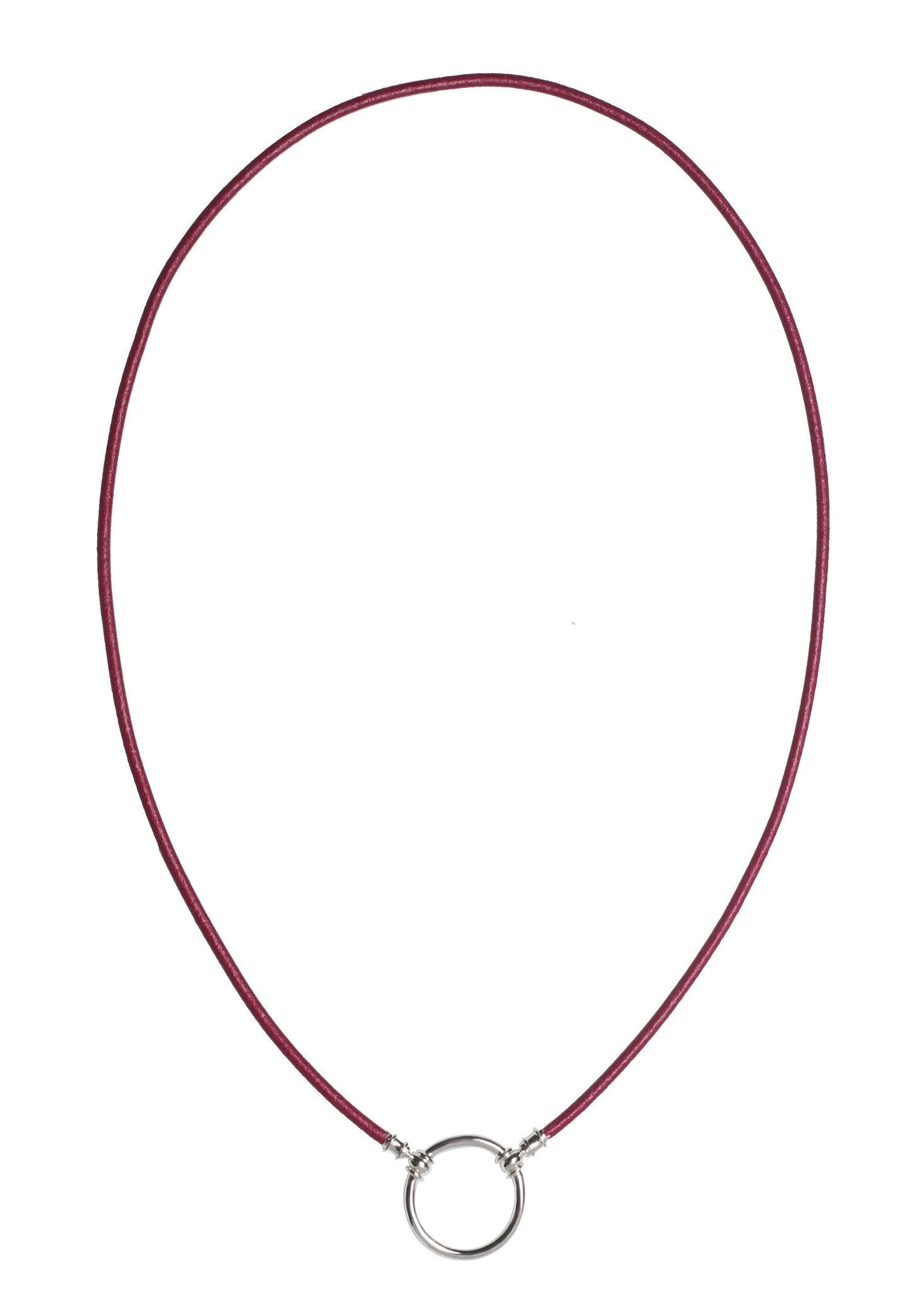 The red Italian smooth leather in this piece is handmade in a 5th generation mill outside of Venice, Italy. Material: Italian Smooth Leather in Red Loop: 23mm in diameter; Silver Plated Necklace length: 25 inches