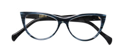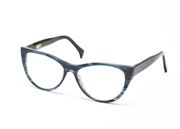 Translucent rich blue cat-eye frames with black temple arms in a polished finish Specifications: Lens width: 51mm Lens height: 39.8mm Temple length:åÊ 145mm Bridge: 16mm Description: Inspired by Tracey Emins. About the artist: Tracey Emin is a British artist whose confessional and emotionally engaging work employs an exceptionally wide range of media traditionally “feminine” craft techniques such as needlework and appliqué to create provocative autobiographical pieces that explore the artist’s turbulent past. Sizing Guide