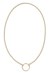 The Italian braided leather in this piece is handmade in a 5th generation mill outside of Venice, Italy. The stunning gold on gold combination is sure to add a touch of elegance to any outfit. Material: Italian Braided Leather in Gold (3.5mm) Loop: 23mm in diameter; Silver Plated, Dipped in Vermeil  Necklace length: 25 inches