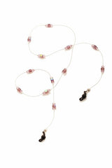 Keep track of your glasses in style with this clear elastic, Swarovski, and Czech glass leash. Designed and handmade in Los Angeles, every leash has 12 glass purple cubes spaced 1.5 inches apart, with a matching Swarovski crystal on each side of every cube.