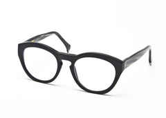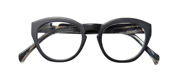 Matte black keyhole frames with translucent temple arms inlayed with a herringbone pattern and subtle glitter