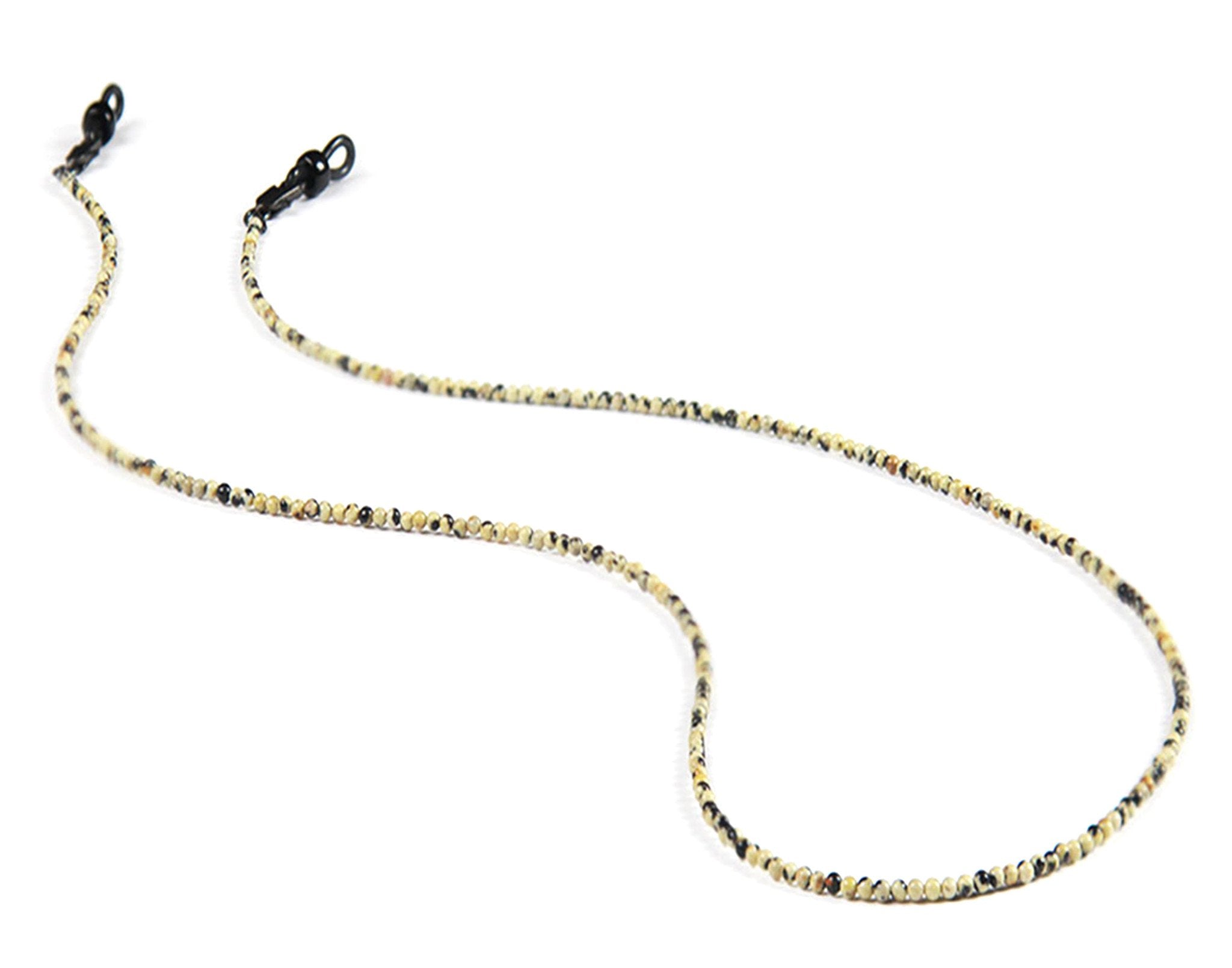 This Dalmatian Jasper bead leash is handmade and designed in house in Los Angeles. The piece’s multicolored beads are eye-catchingly beautiful and create a striking piece guaranteed to help keep your glasses within reach.  Each bead is 1mm in size and the leash is 25 inches long with rubber tips closed with a 1 inch gunmetal finding (all made by hand!).