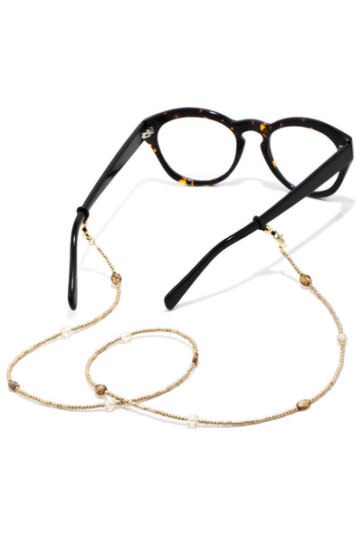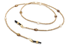 This piece features alternating cylindrical and round gold beads with individual stone and glass oval beads.   The leash is 25 inches long with rubber tips closed with a 1 inch gold finding (all made by hand!).