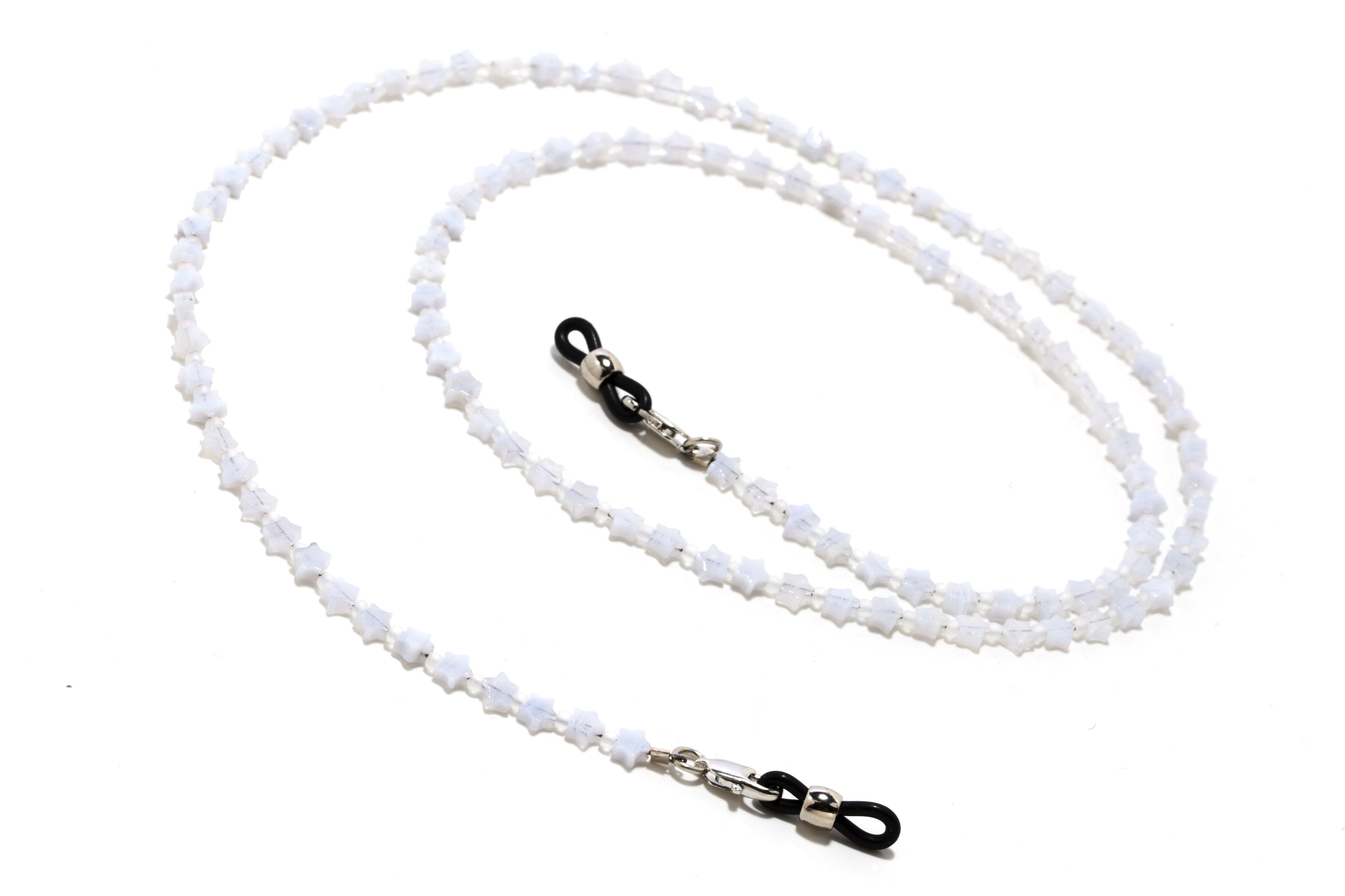 Each star bead is 4mm in size, with alternating white seed beads, and the leash is 25 inches long with rubber tips closed with a 1 inch silver finding (all made by hand!).