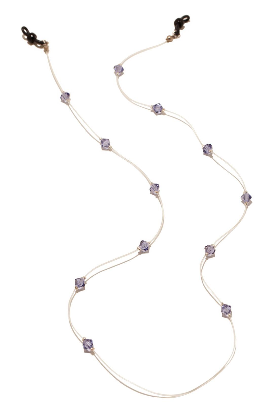 Handmade in Los Angeles, this clear elastic and Swarovski Tanzanite Czech glass bead leash will help you never lose your glasses again. Every leash has 12 opaque beads spaced 1.5 inches apart.